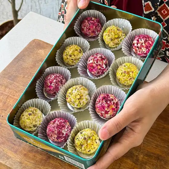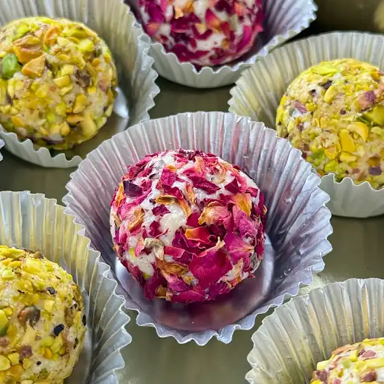 Relish these irresistible truffles crafted with desiccated coconut 🥥, creamy milk powder 🥛, and a drizzle of honey 🍯 for gentle, natural sweetness. Elegantly rolled in crisp pistachios 🟢 and aromatic rose petals 🌹, they are a perfect Diwali 🪔 indulgence, combining festive charm with exquisite flavor. ✨
