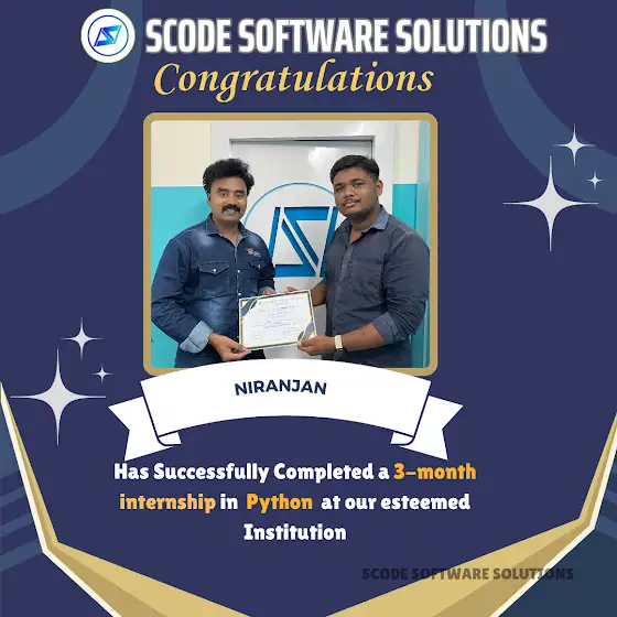 Weβre delighted to announce that *Niranjan* has successfully completed a *3-Month Internship in Python* at *SCODE Software Solutions*! π»π