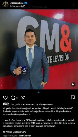 Así es. CM& finaliza esta noche. Desde hace días sus anclas y reporteros se han estado despidiendo del informativo que sobrevivió a la crisis generada por el arribo de los canales privados y sostuvo el moribundo Canal Uno hasta ahora.