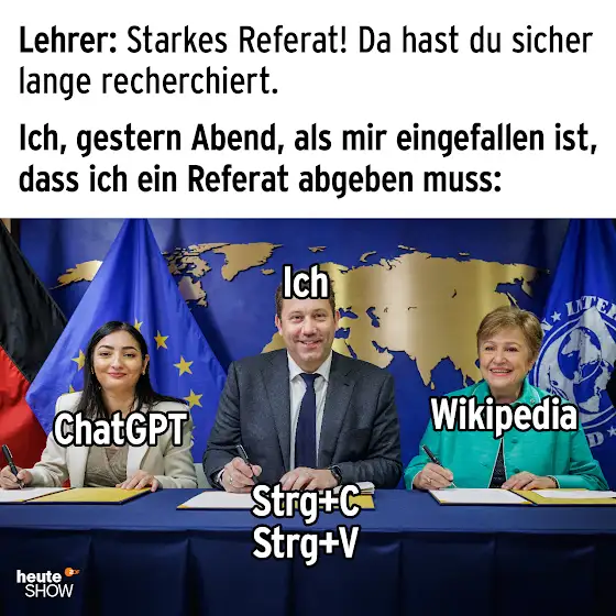 Ich stelle mir ein Referat heute total einfach vor. Der Lehrer kann vielleicht prüfen, ob Wikipedia genutzt wurde. Aber a.i. ist kaum nachzuweisen wenn man diese genutzt hat.