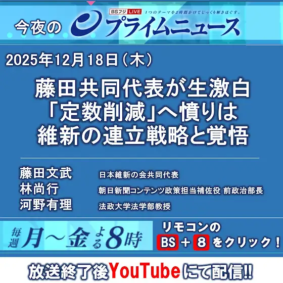 今夜は『藤田共同代表が生激白 「定数削減」へ憤りは 維新の連立戦略と覚悟』ゲストに3名を迎えじっくりお話を伺います。藤田文武 (日本維新の会共同代表)林尚行 (朝日新聞コンテンツ政策担当補佐役 前政治部長)河野有理 (法政大学法学部教授)👉 www.bsfuji.tv/primenews/