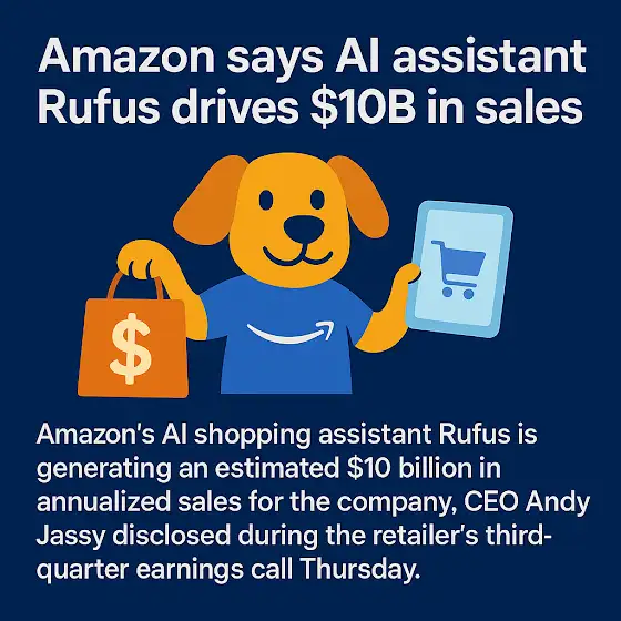 Amazon's AI shopping assistant Rufus is generating an estimated $10 billion in annualized sales for the company, CEO Andy Jassy disclosed during the retailer's third-quarter earnings call Thursday. The announcement underscores how artificial intelligence is becoming a significant revenue driver for the e-commerce giant as it competes with tech rivals in the rapidly evolving AI landscape.