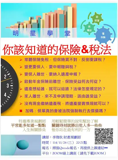 台灣人喜愛買保險、保險滲透力超高,生活上總會聊到今年領多少或是醫療保障內容是什麼,卻對保險和稅法的關係不熟悉,常常誤入迷思、捶心肝嘆陷阱好多!我們推薦📳線上講座,不用出門、或在通勤的路上,就可接收到我們專業的保險與稅法新知!學會基本法律保障的認識,以安心、寬心做好規劃!!法律權益,是保障懂法律的人!!這個講座將為你打開全新👍了解!!一場線上講座,簡單明瞭,給你重點~💡李雅秋 財產規劃師 主講💡114/11/26(三)20:00-21:00💡主題: 你該知道的保險&稅法———————-報名聯結如下:forms.gle/vzE2CRBKUCNBAbbp9