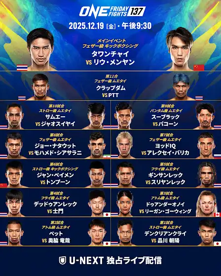 ◤⚡️今夜の対戦カード⚡️◢2025年度ONE最終戦最新の全対戦カードがこちら! 日本から4️⃣名が参戦🔥士門、品川朝陽奥脇竜哉 、スリヤンレック注目のメインカード🥊タワンチャイ🆚リウ・メンヤンエルブルース・オスマノフ選手が怪我のため、本大会を欠場することとなりました。 代わってアレクセイ・バリカ選手が緊急参戦し、ヨッドIQ選手と対戦いたします。 オスマノフ選手の一日も早い回復を、心よりお祈り申し上げます。✅ U-NEXTで独占ライブ配信をお見逃しなく👉 bit.ly/OFF137_UNEXT🗓 12月19日 午後9時30分 | #ONEFridayFights137 #WeAreONE #ONEチャンピオンシップ