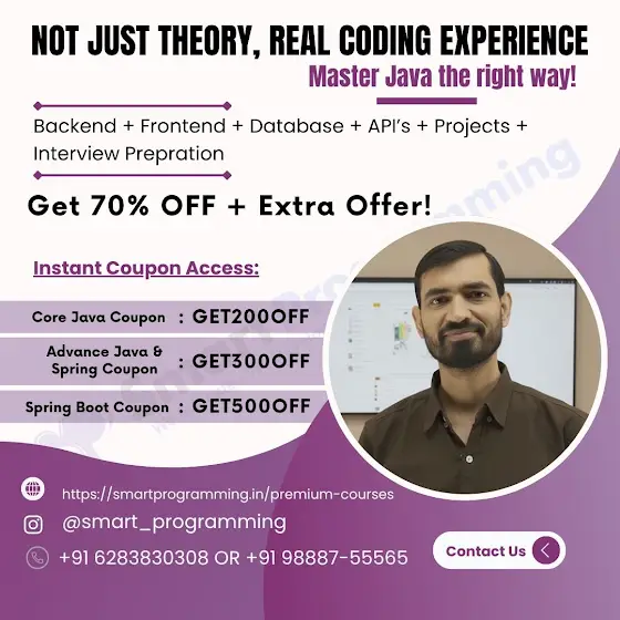 👉 Core Java – ₹200 OFF 👉 Advanced Java + Spring Framework – ₹300 OFF 👉 Spring Boot – ₹500 OFF