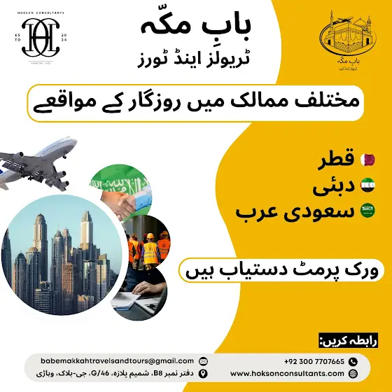 ✈️ بابِ مکہ ٹریول اینڈ ٹورز کے ساتھ اپنا روزگار بیرونِ ملک بنائیں! قطر، دبئی اور سعودی عرب میں ورکس پرمٹ کے سنہری مواقع 🌍 محفوظ، تیز اور قابلِ اعتماد سروس کے ساتھ آج ہی اپلائی کریں آپ کا بہتر مستقبل ہماری ذمہ داری ہے۔
