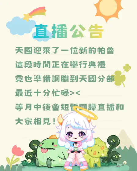 【直播公告】前陣子霓回天國出差,一時半刻還回不來 (つд⊂)有好多事要忙、還要與灰塵對抗 > <!!! 月中過後會短暫回歸直播,再過一陣子就會正式回歸啦!大家記得等霓呦 *ଘ(੭*ˊᵕˋ)੭* ੈ✩‧₊˚