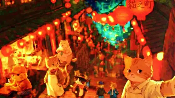 【明日夜8時、ねこの町内会旅行へ出発します】みなさん、こんばんは。 実は、ねこのまちには「町内会」があるのをご存知でしたか?年に一度のお楽しみ、ねこたちの慰安旅行。 今年の行き先は……朱色の提灯が幻想的に揺れる「台湾」です🇹🇼✨マタタビ建設の主任さんやねこのジャズバンドのマネージャーさんも参加することになり、賑やかな旅になりそうです。たどり着いたのは、山の斜面に広がる不思議な場所。 通称「猫九份(ねこきゅうふん)」。迷路のような石段、美味しそうな湯気、そしてどこからか聞こえる懐かしい音楽……。 日が暮れると、そこは魔法がかかったように美しい世界に変わります。パスポートはいりません。 ねこたちの後ろをついて、路地の奥へお進みください🐈🐾
