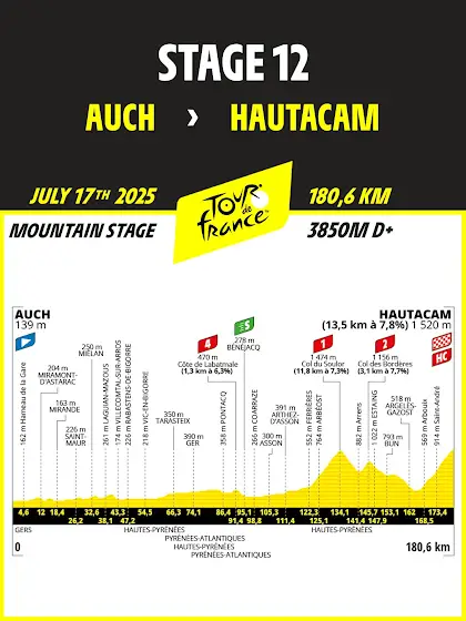 Watch the stage explained and described here / L'analyse de l'étape du jour : www.letour.fr/en/video/9923/briefing-stage-12-by-c… 🚲 Stage 12 / Étape 12 🚲 🚩 Auch 🏁 Hautacam 📏 180,6 km ⏰ 13:10 CEST > 17:44 CEST ⛰ 1xHC, 1x1️⃣, 1x2️⃣, 1x4️⃣ 💚 km 95,1 #TDF2025