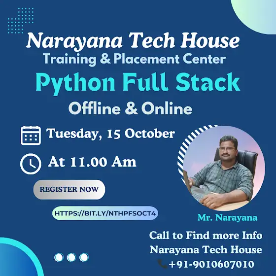 The New Online & Offline Python full stack Batch is starting from (15-10-2024), Tue at 11Am By Narayana Sir.Click here for the live session registration Link. bit.ly/nthpfsoct4For More Information: Narayana Tech House 📞 +91-9010607010