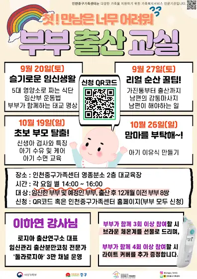안녕하세요! 로지아출산연구소 대표, 이하연 입니다. 풍성한 가을을 맞아 인천중구 가족센터에서 임산부 및 예비부모교실을 열어주셨어요! 9월 20일 이번주 토요일은 "슬기로운 임신생활"을 주제로 5대 영양소로 건강한 임산부 식단 짜는 방법과 태교명상에 대해 알려드리구요. 다음주 토요일 27일은 "리얼 순산꿀팁" 강좌가 있습니다. 가진통부터 출산까지, 남편의 시원~~한 감통마사지, 남편이 출산하는 아내를 위해 해줘야 하는 일까지 꿀팁만 꽉꽉 채워넣었어요.10월19일 일요일은 "신생아부터 100일까지" 아기돌보기의 기본기와 주의사항, 추천 육아용품까지 초보 엄마와 아빠에게 꼭 필요한 내용으로 강의합니다. 10월 26일은 제 강의는 아니지만 "이유식 만들기' 강좌가 있으니놓치지 말고 신청하세요! <인천중구 가족센터 임산부교실>★ 1회. 9월20일(토) 14~16시 슬기로운 임신생활! 임산부 건강한 식단부터 태교명상까지 (강사 : 이하연 대표)★ 2회. 9월 27일(토) 14~16시 리얼출산 꿀팁! 가진통부터 출산까지 (강사: 이하연 대표)★ 3회. 10월 19일(일) 14~16시 초보부모 탈출! 신생아 검사부터 수면교육까지 (강사: 이하연 대표)◆ 4회. 10월 26일(일) 14~16시 맘마를 부탁해~! 아기 이유식 만들기3회이상 들으시는 분은 브라운체온계도 선물로 받으실 수 있습니다 ^^※ 신청 및 접수는 아래 큐알코드 또는 인천중구 가족센터 링크에서 하시면 됩니다!icjung.familynet.or.kr/web/lay1/program/S1T304C450…