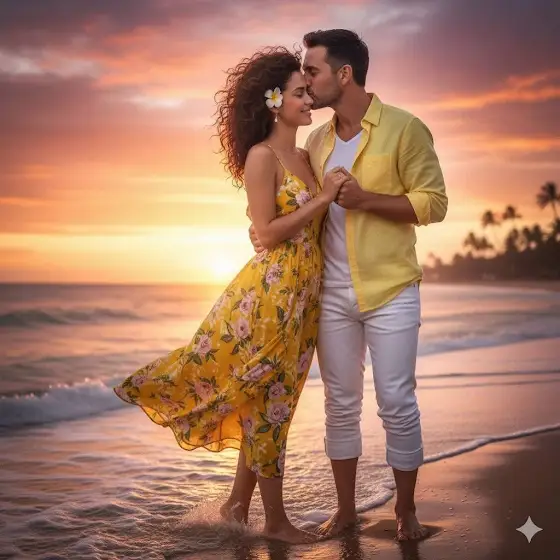Ultra-realistic 4K portrait of a romantic couple on a serene beach at sunset. The girl has the exact same face and facial expression as the provided reference (no alterations). She is wearing a flowing white floral dress that catches the breeze, her curly, slightly messy hair tousled naturally by the sea wind, with a delicate white flower tucked behind her ear. Minimal, subtle diamond jewelry adds an elegant touch. The man, in a crisp white shirt and well-fitted blue jeans, holds her hand gently as soft sea waves wash over their feet. Bathed in warm, golden sun-kissed light, the moment glows with intimacy. The man leans in tenderly to kiss her cheek, capturing a timeless and romantic mood. The background blends vivid hues of orange, pink, and purple across the sky and reflects on the ocean, emphasizing the soft, dreamy, and cinematic atmosphere.