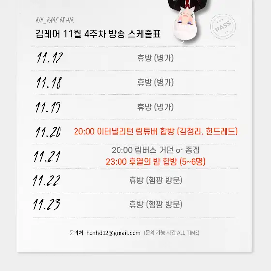 이번주 방송 스케줄표 다시 짜왔습니다! 구내염이 아직 심해서 오늘까지만 쉬겠습니다.. 죄송합니다.... 대신 내일부터 합방을 가져왔습니다 !!!!!!!!!!!