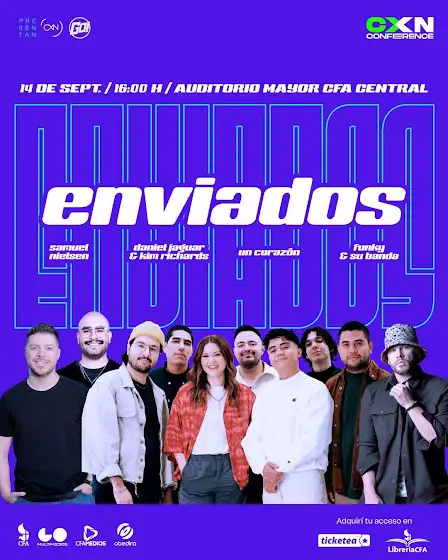 Conferencia anual de jóvenes de la iglesia CFA 🔥✝️¡ENVIADOS! 🌍 Mateo 28. 19-20En esta edición con la participación especial de: Kim Richards y Daniel Jaguar | Samuel NielsenFunky con toda su banda y la agrupación Un Corazón❤️🔥🗓️ Sábado 14 de septiembre⏰ 16:00📍Lugar: Auditorio mayor de CFA Central🚀 Accesos: Librería del CFA y Ticketea (cupos limitados).📲 Para más información y actualizaciones sobre la conferencia seguir las redes sociales de @goteenpy y @conexionpy