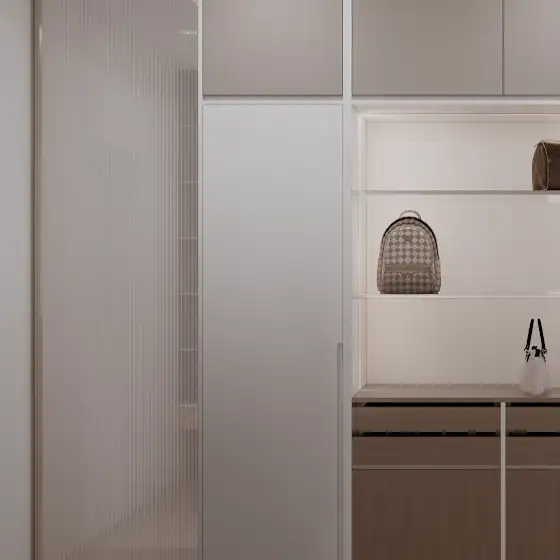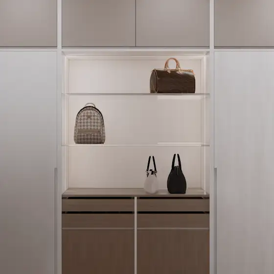 - 複合式收納,滿足多元需求:利用客製化的系統櫃,巧妙結合了衣櫃、展示櫃、梳妝台與臥榻,不僅有效利用空間,更讓機能與美學完美融合。