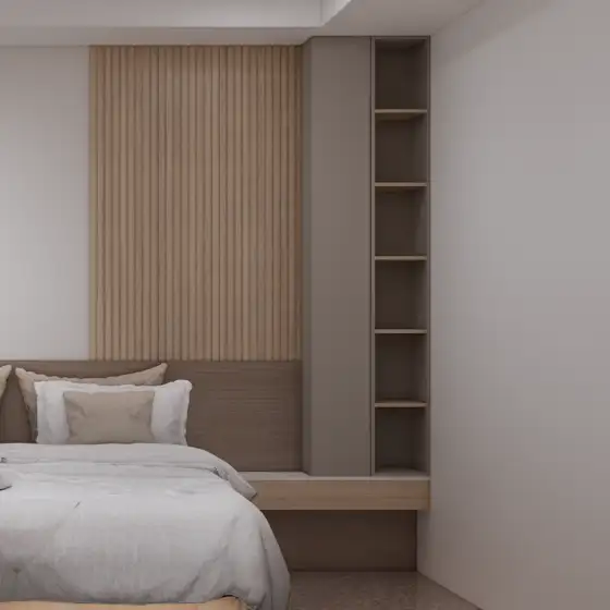 - 層次豐富,細節處見用心:床頭背板以白榆木山紋與淺色維琴察橡木造型格柵相互搭配,加上米灰色的收納櫃體,創造出豐富的視覺層次,讓空間更顯精緻。
