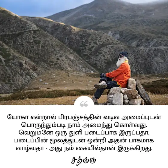 யோகா என்றால் பிரபஞ்சத்தின் வடிவ அமைப்புடன் பொருந்தும்படி நாம் அமைந்து கொள்வது. வெறுமனே ஒரு துளி படைப்பாக இருப்பதா, படைப்பின் மூலத்துடன் ஒன்றி அதன் பாகமாக வாழ்வதா - அது நம் கையில்தான் இருக்கிறது.#SadhguruQuotes #குருவாசகம் #yoga #cosmic #creation #SadhguruTamil