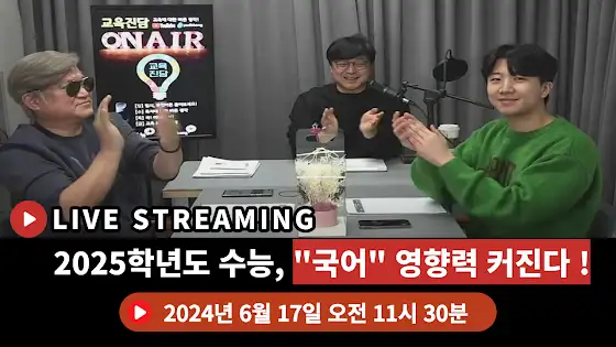 교육진담TV [입시 무엇이든 물어보세요] 라이브 방송 일정 날짜 : 2024년 6월 17일 (월) 시간 : 오전 11시 30분 주제 : 2025학년도 수능, "국어" 영향력 커진다 ! 교육진담 전용 HP : 010-5009-0800 교육진담 폰으로 입시 관련 상담/질문 카톡 또는 문자로 남겨주세요 !많은 관심 부탁드립니다.
