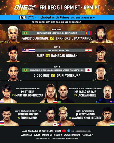 GET READY 🔥 ONE Fight Night 38 on Prime Video goes LIVE tonight with an epic card, headlined by Fabricio Andrade's clash with Enkh-Orgil Baatarkhuu for bantamweight MMA gold! Who are your picks to win?