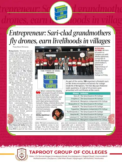 #TaprootGroupOfColleges #LeadersOnCampus #RithikaAgnishwar #GarudaAerospace #DroneInnovation #WomenWhoInspire #LearningBeyondTheClassroom #BreakingBarriers