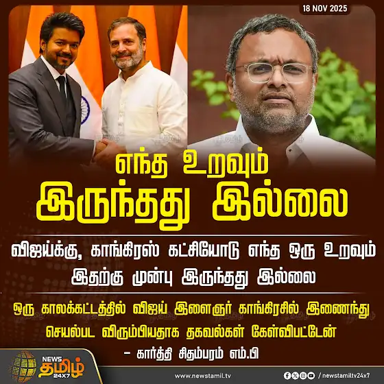 #NewsTamil24x7NewsUpdate | எந்த உறவும் இருந்தது இல்லைவிஜய்க்கு, காங்கிரஸ் கட்சியோடு எந்த ஒரு உறவும் இதற்கு முன்பு இருந்தது இல்லைஒரு காலக்கட்டத்தில் விஜய் இளைஞர் காங்கிரசில் இணைந்து செயல்பட விரும்பியதாக தகவல்கள் கேள்விபட்டேன் - கார்த்தி சிதம்பரம் எம்.பி#TVKVijay #TVK #Congress #KartiChidambaram #Election2026 #TamilNews #NewsTamil #NewsTamil24x7