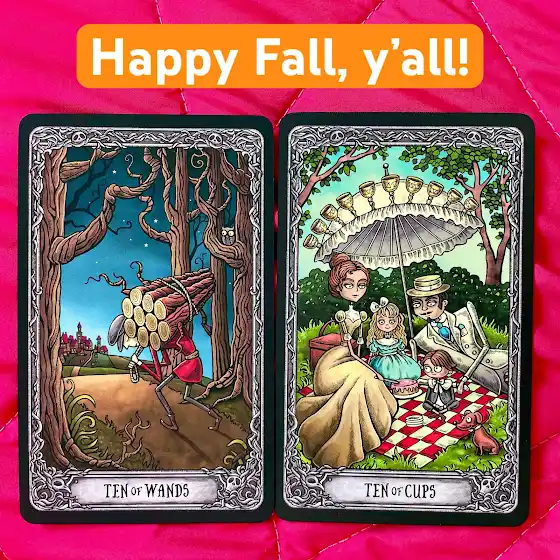 The isolation and sense of being overwhelmed in the Ten of Wands is perceptual. As is the love and togetherness of the Ten of Cups. A shift in your attention from one to the other is all it takes to bring you from one picture to the other. There is a natural flow of this energy happening in the world during this time, and you can ride that wave much more easily and enjoyably by letting yourself see all the love and happiness that is here for you. ๐งก