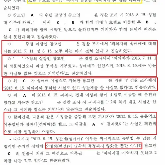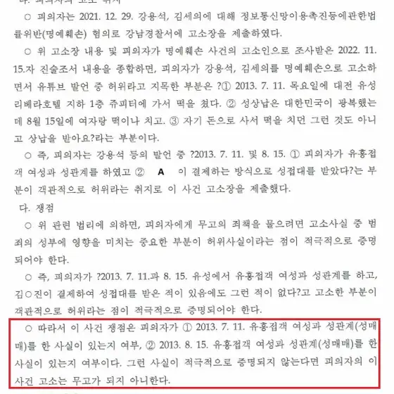 이어 김 변호사는 2013년 7월 11일 성매매와 관련해 "구체적으로 참고인 A은 참고인 B으로부터 전해들었다는 입장이고, 이 날의 경우 참고인 A이 목격한 바는 없었고 참고인 B은 성상납이 2013년 8월 15일이고 2013년 7월 11일이 아니며, 의전을 해서 명확히 안다고 하다가 2013년 8월 15일자 유성관광호텔의 예약내역이 확인되지 않자 2013년 7월 11일에 성접대가 있었다고 말을 번복하였고, 2013년 8월 15일에는 직접 의전하지 않았다고 했고 참고인 C는 그해 7월 11일 (성접대가 의심되는) 일정은 기억나지 않는다고 말했다"고 지적했다.