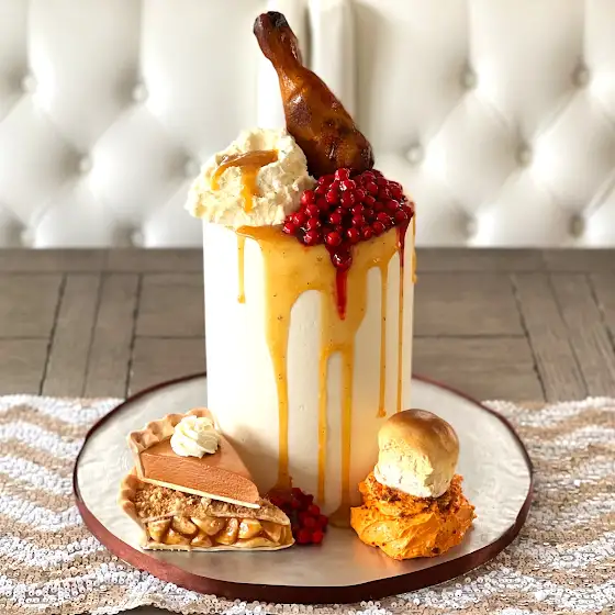 Thanksgiving cake, complete with buttercream mashed & sweet potatoes, and chocolate pie slices, dinner roll, turkey drumstick and cranberry sauce. With some gravy, a little on the sweeter side. ;)