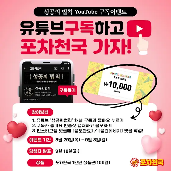[포차천국 X 성공의법칙] 🎉유튜브 구독하고 포차천국 가자!🎉 📌참여방법 1. 유튜브 '성공의법칙' 채널 구독과 좋아요 누르기 2. 구독과 좋아요 인증샷 캡쳐하고 응모하기3. 포차천국 공식인스타그램 댓글에 [응모완료] / [응원메세지] 댓글 작성!응모하기 : forms.gle/goymMkv8doaGpLU77포차천국 공식 인스타그램 : www.instagram.com/pocha_heaven_official/ 📆이벤트 기간 24년 8월 29일(목) ~ 9월 8일(일) 🎁당첨자 발표 9월 10일(화) 🎁 상품 포차천국 1만원 상품권(100명) ※ 경품 발송을 위해 이벤트 당첨자 대상으로 개인정보 수집 및 활용을 요청할 수 있습니다. ※ 부정 참여 및 중복 계정의 경우 당첨자 선정 시 제한이 있을 수 있습니다. ※ 포차천국 1만원 상품권은 오프라인 매장에서 3만원 이상 결제 시 사용이 가능합니다. ※ 포차천국 1만원 상품권은 타 쿠폰과 중복사용 불가하며 배달 주문 시 사용 불가합니다.
