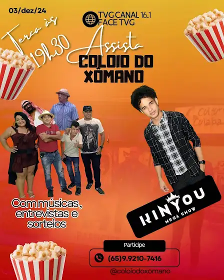 E aí, galera! Hoje, 03/12, a partir das 19h30, estarei ao vivo no Coloio do Xômano cantando pra vocês! Liga na TVG canal 16.1 ou acompanhe pelo Facebook da TVG. Não perca, conto com sua audiência!