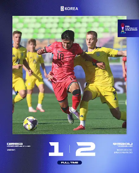 [FT] 대한민국🇰🇷 1-2 🇺🇦우크라이나 후반전 내내 맹공을 퍼부었지만, 동점에는 닿지 못했습니다. 이제 2차전 파라과이전만 생각하고 준비합니다. 끝까지 함께 싸울 수 있도록 많은 응원 부탁드립니다! 🇰🇷🔥 ✔️2025 FIFA U-20 월드컵 조별리그 2차전 🇰🇷v🇵🇾#파라과이 10.01(수) 08:00 📺JTBC, NAVER, 치지직 📍칠레 ⏰한국 시간 기준 #대한민국 #U20 #남자축구국가대표팀 #U20WC