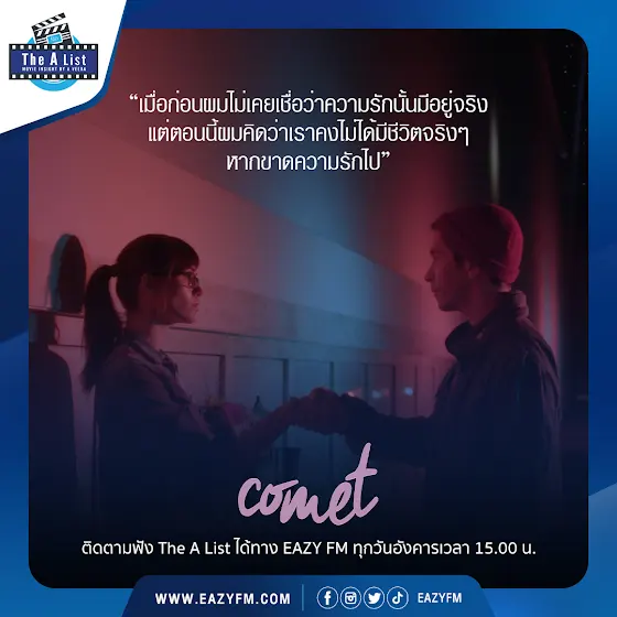 #TheAList ขอแนะนำประโยคสุดประทับใจ จากภาพยนตร์เรื่อง #Comet เรื่องราวเกี่ยวกับความรักของโลกคู่ขนาน ที่ทำให้คนสองคนได้พบเจอและรักกันในค่ำคืนของวันที่เกิดปรากฎการณ์ดาวหาง และสร้างปาฎิหาริย์ให้ใครบางคนได้เชื่อในความรัก ติดตามฟัง The A List ได้ทุกวันอังคาร บ่ายสาม ทาง Eazy FM 105.5