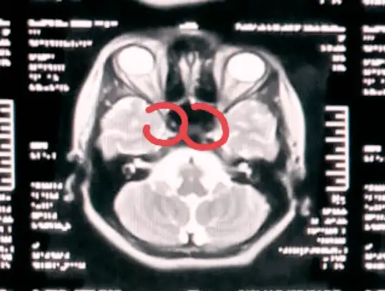 Right and left internal carotid artery circled in red in a T2 axial MRI image
