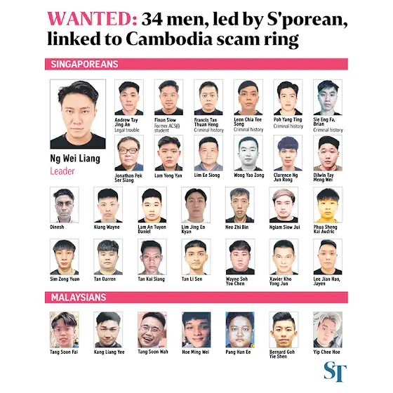[str.sg/BLkk] 27 Singaporeans and 7 Malaysians are wanted for their suspected roles in 438 scam cases involving losses of at least $41 million.The alleged masterminds of the gang that ran the operation in Cambodia were a pair of brothers and their cousin.