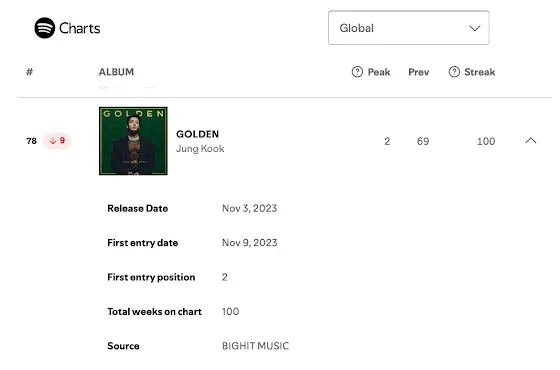 Jungkook’s “GOLDEN” has now spent 100 weeks on Spotify Global Weekly Top Albums Chart, becoming the first album by a K-pop soloist ever to achieve this!
