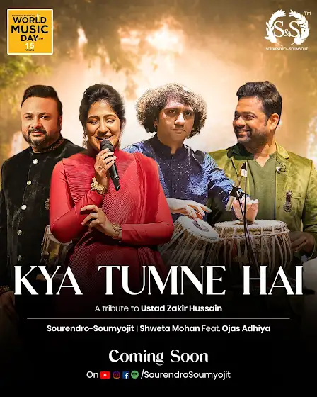 'Kya Tumne hai Keh Diya' is structurted as a musical homage to Ustad Zakir Hussain, designed to blend narrative storytelling with his composition. Shweta Mohan and Ojas Adhiya joins Sourendro-Soumyojit on World Muaic Day Concert 2025 to create this tribute act.