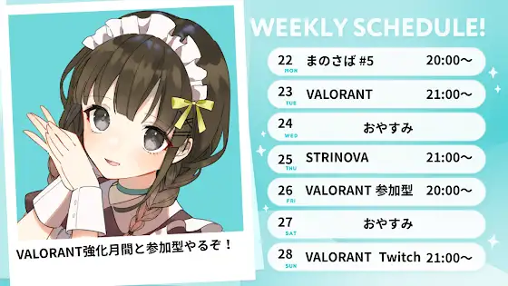 こちら今週のスケジュールです!VALORANT、AIMつよつよになりたいのでがんばるぞー!参加型もやるのでお時間合えば一緒に遊ぼうね💕#ゆーあーるえる#VTuber