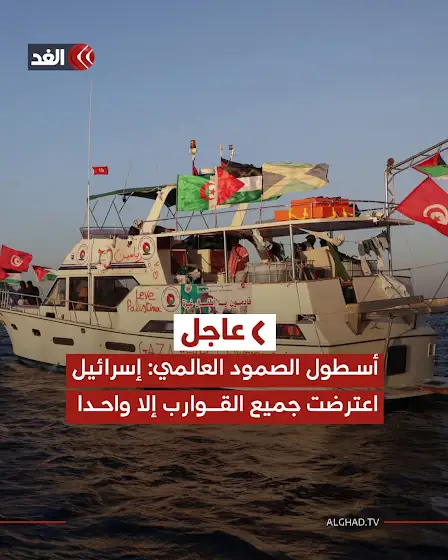 #عاجل | أسطول الصمود العالمي: إسرائيل اعترضت جميع القوارب إلا واحدا هو «مارينيت» الذي لا يزال يبحر باتجاه غزة#قناة_الغد #الغد_عاجل