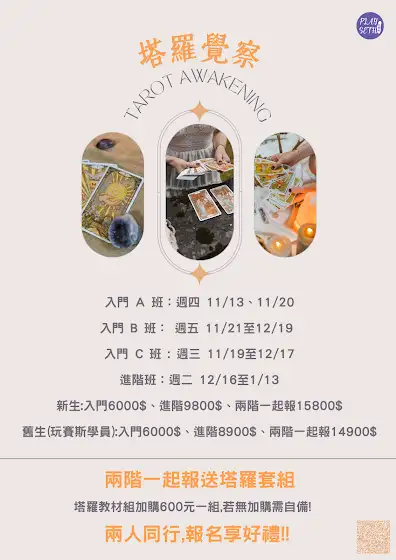 塔羅覺察 Tarot Awakening 塔羅,不是預言,是對話。 我們練的是:把牌當語言,把自己聽懂;把看見的東西,放進生活。 這堂課,會帶你把直覺與牌義接上電,再用牌陣把訊息排成路徑。 你不用背很多結論,只要學會問對問題、抓到脈絡,答案就會自己浮上來。 ✨透過學習✨ 我們一起讀牌,一起實際演練 ✅猶豫轉化成選擇! ✅把感覺變成行動! ✅把答案變成下一步! 🎓修習完成,頒發學習證書🎖️ 📍上課地點:玩賽斯工作室 📍上課時間19:00-20:30 🗓課程日期: 入門 B 班:每期 5 堂課|每週五|11/21、11/28、12/5、12/12、12/19 入門 C 班:每期 5 堂課|每週三 |11/19、11/26、12/3、12/10、12/17 進階班:每期 5 堂課|每週二 |12/16、12/23、12/30、1/6、1/13 💰課程費用: 新生:入門6000$、進階9800$、兩階一起報15800$ 舊生:入門6000$、進階8900$、兩階一起報14900$ 🌕多元支付:現金/匯款/信用卡/paypal。 ⭐️入門/進階*兩階一起報名,加贈「精美塔羅牌卡學習套組*1」 ▶️ 報名表填寫:forms.gle/Bak8iEVi3QVbeNEm6