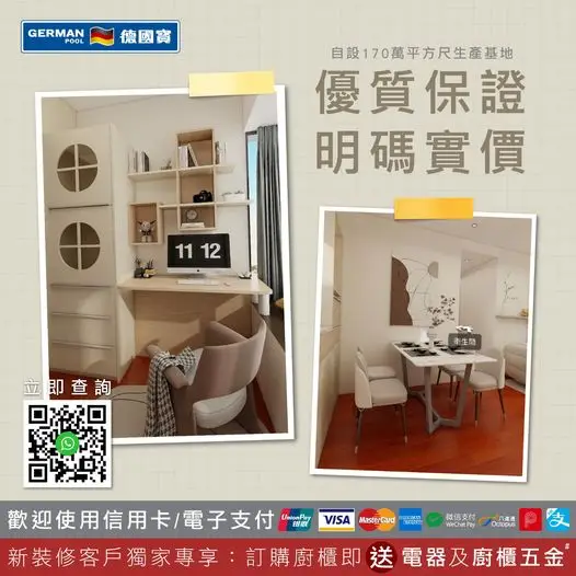 打造「您」想家居~德國寶幫到您! 明碼實價.優質保證! 【立即查詢】 → bit.ly/43lzHtD 德國寶高級訂製櫃系列,由清拆*、設計到安裝都一條龍幫您搞掂晒!自設170萬平方尺生產基地,採用德國頂尖技術及設備,全自動化智能生產,榮獲ISO9001管理系統認證,品質有保證,而且所有產品明碼實價,仲有專人一對一專業跟單,唔使自己左度右度,係您嘅信心首選~輕鬆幫您打造「您」想家居👩🏻🍳🧑🏻🍳! 德國寶由訂製廚櫃、餐枱餐椅、升降電腦枱、現成傢俬、變形傢俬、積木地台收納傢俬、訂製梳化、浴室櫃到五金配件、床褥及嵌入式電器都一應俱全,全屋傢俬電器完美配套,一站式為您締造「您」想家居! ‼️新裝修客戶訂購廚櫃即享免費度尺+、免費報價及免費設計,再送電器及廚櫃五金",一站式幫您打造Dream House! ‼️訂購廚櫃可使用信用卡或線上支付平台付款,指定銀行信用卡仲可享12或24個月免息分期添! ---------------------- 銅鑼灣 Fashion Walk 旗艦店 wa.me/85265305963 星期一至日及假期 10:00-21:00 | Fashion Walk 京士頓街9號 土瓜灣陳列中心 wa.me/85293872380 星期一至六 09:00-19:00 | 日及假期 11:00-19:00 九龍灣 MegaBox 陳列中心 wa.me/85290188648 星期一至日及假期 10:00-22:00 | MegaBox L5-5 --------------------- *清拆服務需另行報價。 "受條款及細則約束,德國寶保留最終決定權。 +客人需預付$500度尺費用,並於落訂後全數退回。 #廚櫃 #訂製櫃 #組合櫃 #地台床 #地台 #睡房裝修 #睡房收納 #睡房設計 #床褥 #裝修 #裝修設計 #家居設計 #室內設計 #公屋裝修 #居屋裝修 #安樂窩 #家庭電器 #電器 #德國寶電器 #全屋傢俬