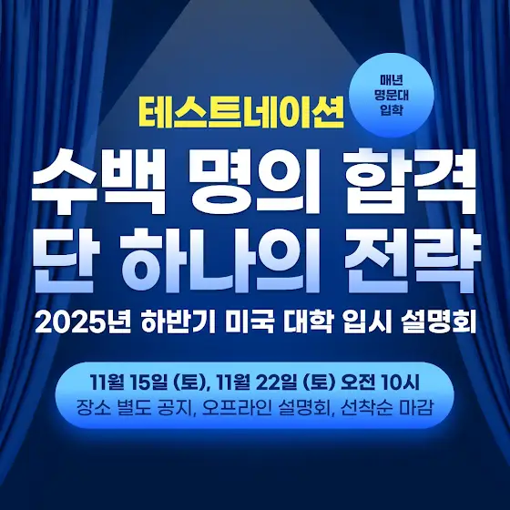 π2025 λ―Έκ΅λν νλ°κΈ° μ€νλΌμΈ μ€λͺ νπ‘ μ€λͺ ν λ΄μ©2026λ μ μ λ°©ν₯κ³Ό μ£Όμ λ³ν,μ§μ μ λ΅μ λν μ λ°μ μΈ λ΄μ©π― λμ : μ νλ λμ, λ―Έκ΅ μ μ μ€λΉ μλ νλΆλͺ¨λπ μ€λͺ ν μΌμ 1μ°¨: 11μ 15μΌ(κΈ) μ€μ 10μ2μ°¨: 11μ 22μΌ(κΈ) μ€μ 10μ(λ μ°¨μ λͺ¨λ λμΌν λ΄μ©μΌλ‘ μ§νλ©λλ€.)π μ₯μ/μκ°: μμΈμ λ΄ (λͺ¨μ§ ν κ°λ³ μλ΄ μμ )π₯ κ·λͺ¨: μμμ μμ΄λ² μ€λͺ νλ μ’μμ΄ νμ λμ΄ μμ΄,μ°Έμ μ μ² ν κ°λ³ νμ μλ΄κ° μ΄λ£¨μ΄μ§ μμ μ λλ€. (μ μ²μ μμ±λ§μΌλ‘λ νμ X)β¨ λ§μ κ΄μ¬κ³Ό μ°Έμ¬ λΆνλ립λλ€.μ μμ€λͺ ν μ μ² λ§ν¬test-nation.imweb.me/185