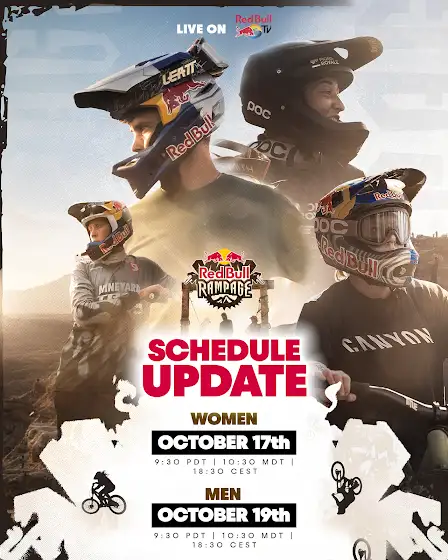 🚨 SCHEDULE CHANGE 🚨 Due to weather conditions, the Red Bull Rampage schedule has been updated. The women’s competition and live broadcast is now scheduled for Friday, October 17th at 10.30am MDT/6.30PM CEST. The men’s competition and live broadcast is now scheduled for Sunday, October 19th at 10.30am MDT/6.30PM CEST! 🚨🤘