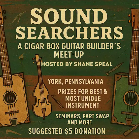 Sound Searchers: A Cigar Box Guitar Builder’s Meet-up - May 10, 1-4pm Calling all instrument makers and music tinkerers! Join us at the York Town Craft Guild in York, Pennsylvania for a one-of-a-kind gathering of cigar box guitar builders and enthusiasts. Whether you’re a seasoned builder or just getting started, this is your chance to connect, learn, and share your passion.