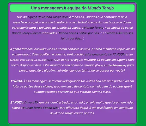 Duvido muito que leiam (seja pelo @Torajo ou pelo @TorajoJovem, mas tá aí pra todo mundo saber)NOTA: O criador do wiki é o @Joao_Miguel_13, eu sou só o Moderador de Conteúdo lá.