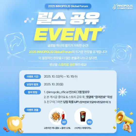 🌐2025 INNOPOLIS Global Forum 인스타그램 릴스 공유 이벤트🌐 글로벌 혁신의 열기가 가득한 순간! 2025 INNOPOLIS Global Forum의 뜨거운 현장을 공개합니다! 👉이 열정적인 현장을 더 많은 분들과 나누고 싶다면, 영상을 스토리로 공유해주세요!✨ 🌳릴스 공유 이벤트 참여방법 ✔️https://www.instagram.com/innopolis_official/ 팔로우 ✔️ 본 게시글 좋아요 & 스토리 공유 후, 댓글에 “참여완료” 작성 ✔️ 친구 태그하면 당첨 확률 UP! (참여완료 댓글에 대댓글로 태그) 📅이벤트 일정 이벤트 기간 : 10/2(목)~10/15(수) 당첨자 발표 : 10/20(월) 🎁이벤트 상품 교촌치킨 허니콤보+콜라 1.25L (8명), 스타벅스 아메리카노 (10명) 🌕 연구개발특구진흥재단과 함께 풍성한 한가위 보내시고, 이번 이벤트에도 많은 관심과 참여 부탁드립니다🙌✨