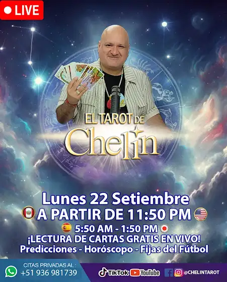 Lunes 22 de Setiembre, EL TAROT DE CHELIN en Vivo desde las 11:50 p.m. Los espero!Dale LIKE a mi página, comparte el live y escríbeme tu consulta sobre el amor, dinero y salud! Inicia conmigo una nueva etapa.Soy CHELIN el vidente. Experto en Ciencias Esotéricas.WhatsApp +51 936981739Citas de manera presencial o por video llamada desde donde te encuentres.Con discreción total en tu consulta.#Vidente #tarotmarsella #lecturatarot #magiablanca #hechizos #tarot #limaperu #amarres #destino #adivinacion #oráculo#arcangeles #cartas#cartasdeamor #cartasdetarot #horóscopo #runasvikingas #Abracadabra #wicca #amarresdeamor #vida #brujas #brujeria #abrecaminos #limpias #conjuros #mediums #hechicero #videntes #magiaroja