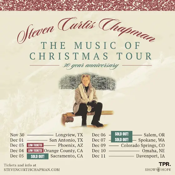 Get tickets and more details at www.stevencurtischapman.com 11/30 Longview, TX 12/01 San Antonio, TX 12/03 Phoenix, AZ - LOW TIX 12/04 Orange County, CA - LOW TIX 12/05 Sacramento, CA - SOLD OUT 12/06 Salem, OR - SOLD OUT 12/07 Spokane, WA - SOLD OUT 12/09 Colorado Springs, CO 12/10 Omaha, NE 12/11 Davenport, IA
