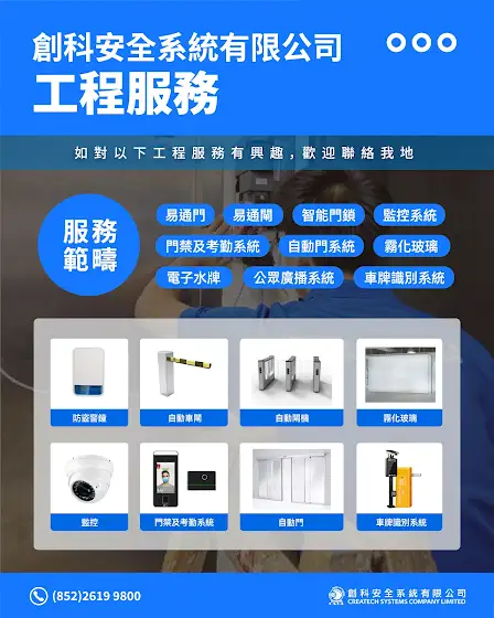 創科安全有限公司工程服務: ✅自動門 ✅監控系統 ✅智能門鎖 ✅霧化玻璃 ✅對講機、門禁系統 ✅車牌識別系統如對任何工程服務有興趣,歡迎聯絡我地 🛜網頁: www.ctsc.com.hk ☎️電話: +852 2619 9800 📱Whatsapp: 2619 9800 📪電郵: info@ctsc.com.hk#創科#易通門#易通閘#磁懸浮#自動門#自動門安裝#智能門鎖#智能家居#自動門維修#保養#感應門#門#自動門機組舊換新#自動門#創科安全系統有限公司#自動門工程#監控系統#智能門鎖#霧化玻璃#對講機#門禁系統#車牌識別系統