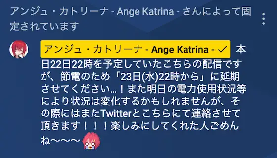 今日のアンジュの新衣装お披露目ですが節電の為、明日に延期となりました状況によっては明日の予定も変更になるかもしれません。Twitterをチェック→twitter.com/ange_katrina_