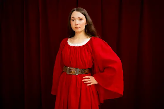 [Alt text: Vasi is wearing a flowy, red Italian Renaissance-inspired shift, secured by a brown belt.]